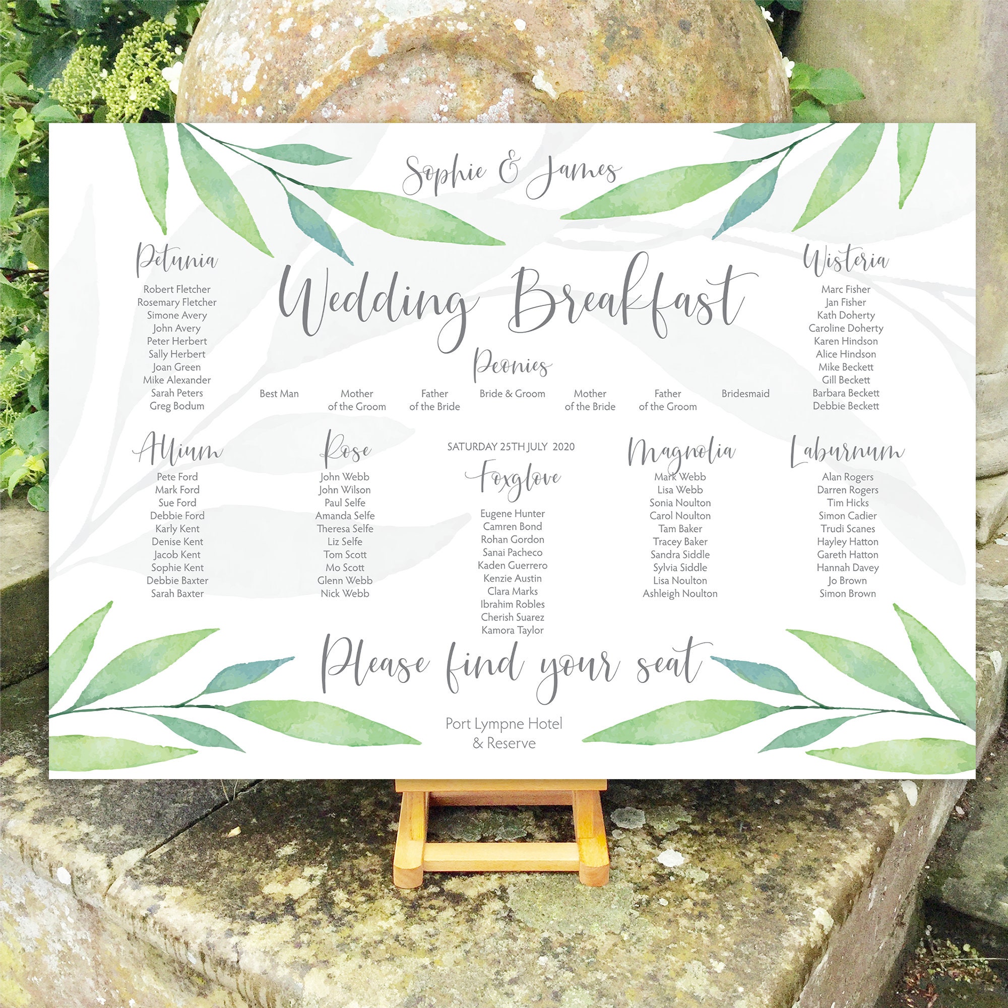 Wedding Table Plan Seating Chart Watercolour Greenery Leaf Etsy Uk